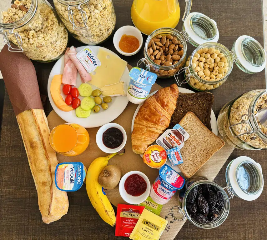 Commencez votre journée dans l’atmosphère raffinée de Menton avec notre petit-déjeuner continental composé de croissants frais, de confitures variées, de fromages, de yaourts, de beurre, de fruits frais de saison et de boissons chaudes. Pour seulement 12€, un petit-déjeuner léger et soigneusement préparé vous attend pour égayer votre journée